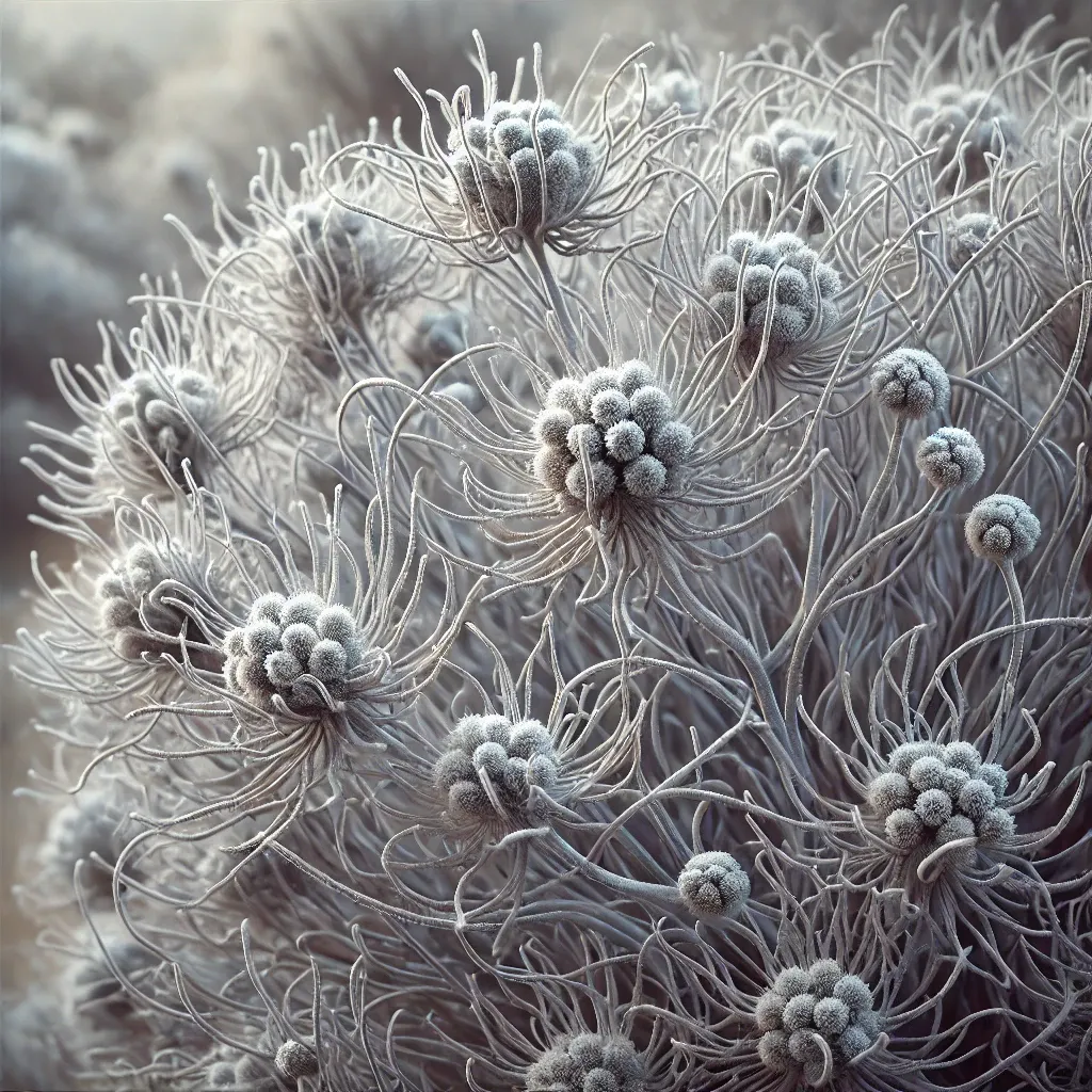 울프스 클로는 Leucophyta 속에 속하는 다년생 식물로, 보통 작은 관목 형태로 자랍니다. 이 식물의 가장 큰 특징은 잎사귀와 줄기가 은빛 또는 회색을 띠며, 이는 햇빛을 반사하여 건조한 환경에서 식물의 수분 손실을 줄이는 역할을 합니다. 잎사귀는 매우 작고 바늘 모양으로 촘촘히 자라나며, 식물 전체가 구형의 관목 형태를 이루는 경우가 많습니다.